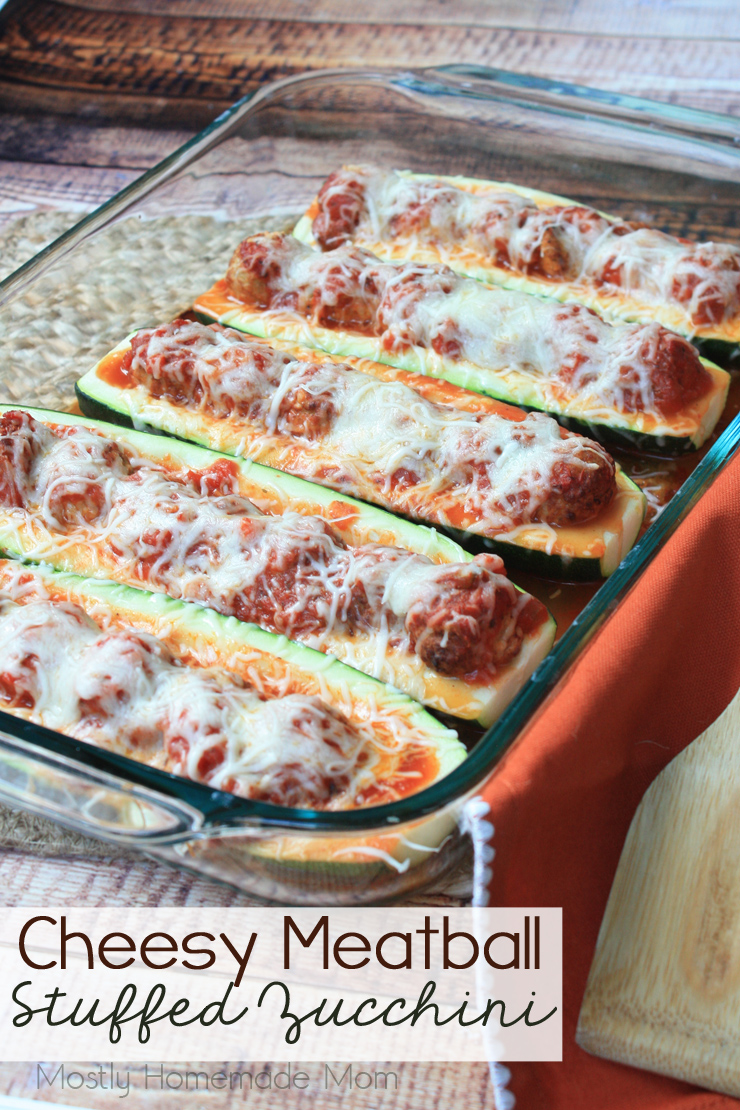 Cheesy Meatball Stuffed Zucchini is super simple and easy for a weeknight meal! Zucchini boats filled with tomato sauce, meatballs, and mozzarella cheese - your family will go nuts for this recipe!